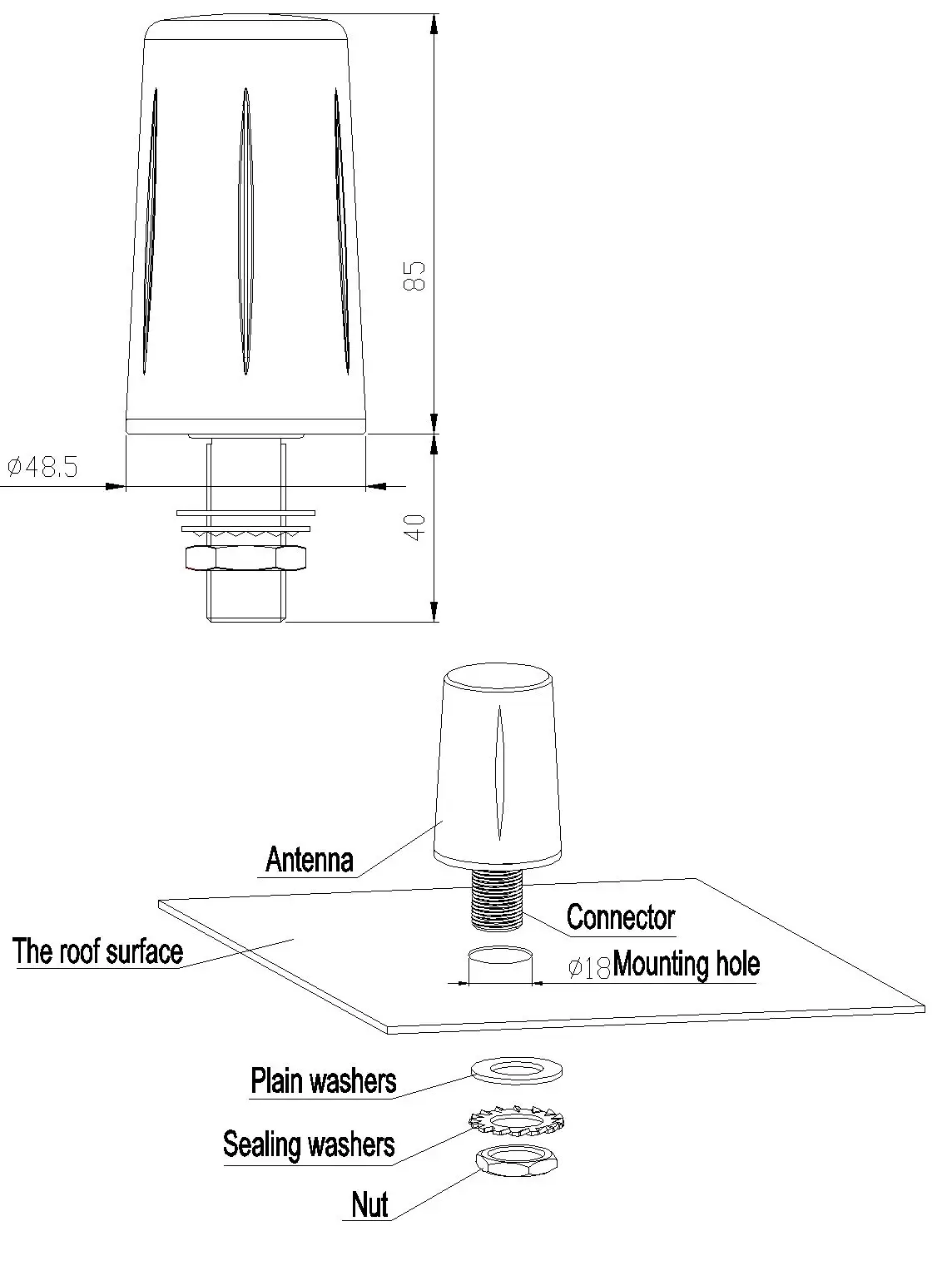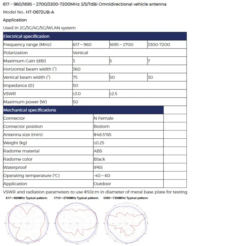 617~960/1695~2700/3300-7200MHz 3/5/7dBi Omnidirectional vehicle antenna